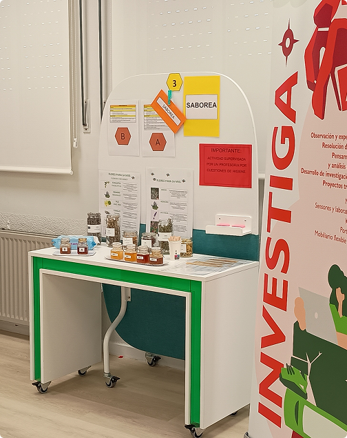 En esta fase el alumnado realiza una cata a ciegas de distintos tipos de miel, identificando diferencias de olor, sabor, textura y otras características organolépticas. También puede descubrir otros productos elaborados por las abejas y relacionarlos con sus principales propiedades.
