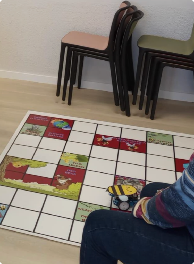 El alumnado resuelve un reto de programación para ayudar a una abeja-robot a ir de flor en flor hasta llegar al panal. La actividad puede desarrollarse primero con un tapete de movimientos y después trasladarse al ordenador o al robot físico. En los materiales del proyecto aparece la programación de un mBot-abeja o robot mediante mBlock, combinando pensamiento computacional, secuencias y resolución de problemas.
