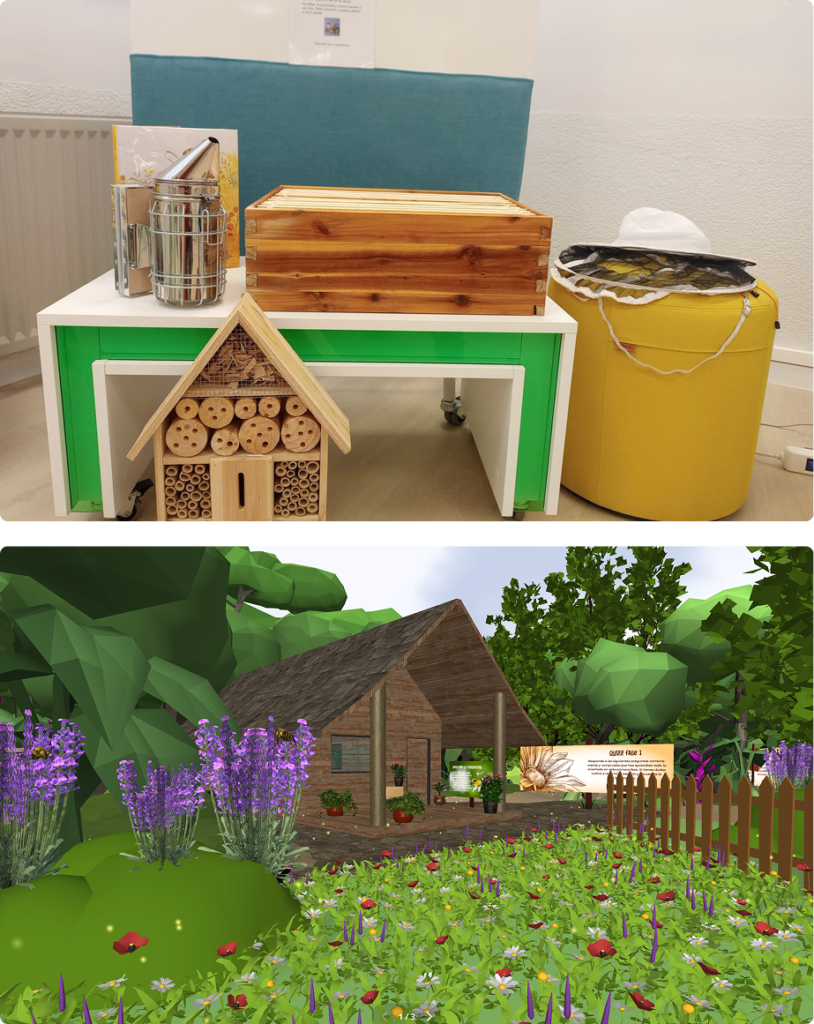 En esta estación el alumnado se adentra en el mundo de las abejas a través de una experiencia inmersiva. Puede explorar un entorno en realidad virtual, observar modelos en realidad aumentada con Merge Cube y conocer también elementos físicos del panal. En los materiales aparece el uso del Merge Cube, la aplicación Object Viewer, gafas VR y la exploración de una colmena y su entorno como si el alumnado fuese una abeja.